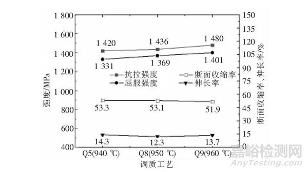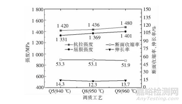 Q5、Q8和Q9試樣的力學性能關系如圖6所示。奧氏體化溫度較高的Q8和Q9試樣的強度均比Q5試樣的高,斷面收縮率和伸長率相差不大,與硬度值的變化規(guī)律相同。