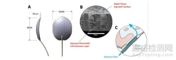 GORE GDI是一種100毫米厚的裝置,由一個雙層膨脹聚四氟乙烯(ePTFE)材料口袋與插入前房的硅膠管連接而成。ePTFE是GORE的專利材料,已用于其他生物醫(yī)學(xué)設(shè)備,包括血管移植物和疝膜。其目的是促進植入術(shù)后的生理組織整合,比目前青光眼引流植入術(shù)形成的纖維囊更薄、密度更低,滲透性更強,潛在地改善水滲透性和持續(xù)降低眼壓。
