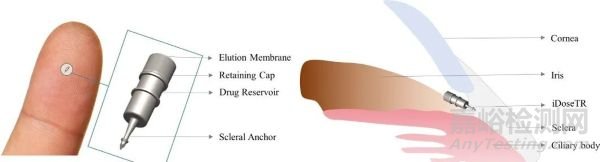 iDose TR 是一款1.8mm*0.5mm的生物相容性鈦植入物。該裝置由一個固定在前房的鞏膜錨、一個包含 75ug 曲伏前列素專有配方的藥物儲庫以及一個帶有洗脫膜的固定蓋組成,提供持續(xù)的曲伏前列素釋放。