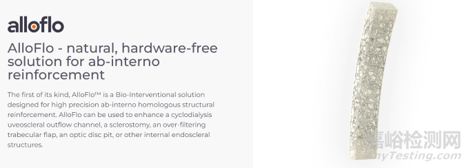 AlloFlo™通過使用同種異體生物組織進行內(nèi)鞏膜加固,以自然地增強葡萄膜-鞏膜流出通道。這種方法不需要任何外部硬件,提供了一種靈活、適應(yīng)性強的植入物,能夠與眼內(nèi)結(jié)構(gòu)相容,減少可能的機械損傷。