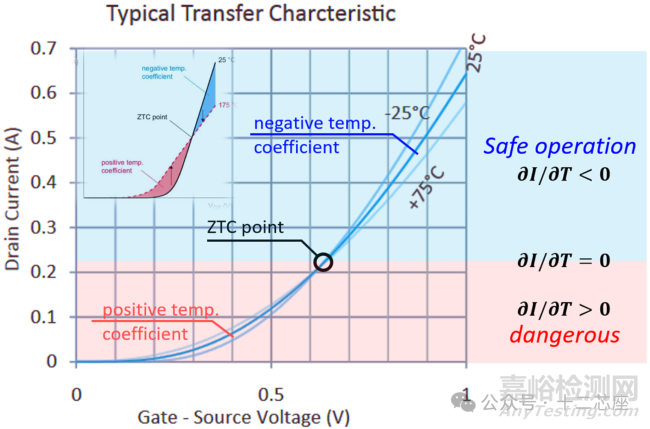對(duì)于低于 ZTC 的操作(∂ID / ∂Tj > 0),溫度系數(shù)為正。在這種情況下,局部熱點(diǎn)隨著溫度升高會(huì)吸收更多的電流。這將導(dǎo)致增加的局部功率耗散和進(jìn)一步加熱。最終,這將導(dǎo)致熱失控和芯片的局部破壞。