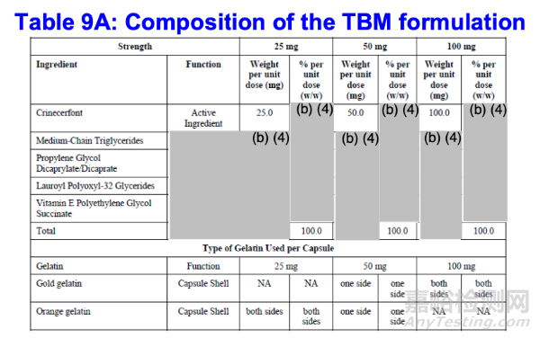 III期研究使用的是50毫克硬明膠膠囊。膠囊填充配方的定性和定量組成在III期膠囊配方和TBM配方中完全相同(表9B)。