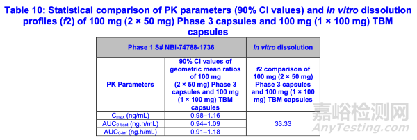 一項I期比較生物利用度研究(研究編號NBI-74788-1736)旨在橋接TBM制劑100 mg規(guī)格與III期50 mg硬明膠膠囊。藥代動力學(xué)參數(shù)(Cmax、AUC0-tlast和AUC0-inf)幾何平均值的90%置信區(qū)間符合0.8-1.25的接受標(biāo)準(zhǔn)范圍(表10)。研究編號NBI-74788-1736的評估由OCP/臨床藥理學(xué)審評員負(fù)責(zé)。盡管2×50 mg III期膠囊與1×100 mg TBM膠囊的溶出數(shù)據(jù)比較顯示f2<50(表10),F(xiàn)DA認(rèn)為,由于比較溶出研究采用的是擬定溶出方法(表7),而該溶出方法是為TBM軟明膠膠囊優(yōu)化的方案,可能不適用于III期硬明膠膠囊。