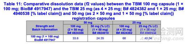 4)表11顯示了TBM 100 mg膠囊(1×100 mg)與注冊規(guī)格TBM 25 mg(4×25 mg和1×25 mg[標(biāo)示量%])及50 mg(2×50 mg和1×50 mg[標(biāo)示量%])膠囊的體外溶出曲線數(shù)據(jù)比較(f2值)