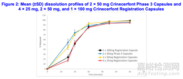 crinecerfont軟膠囊上市了三種規(guī)格,它們的處方比例相擬,擬上市的規(guī)格之間相同劑量的溶出,50mg規(guī)格與100mg規(guī)格之間有明顯的差異,f2因子小于50%。但與III期臨床批次所用50mg規(guī)格對比,擬上市50mg規(guī)格的溶出與其相似,而III期臨床批次所用50mg規(guī)格與III期臨床所用100mg規(guī)格之間的體內(nèi)等效性得到了認(rèn)定,因此擬上市規(guī)格50mg其體內(nèi)的等效性得到了橋接,無需再次進(jìn)行體內(nèi)研究。