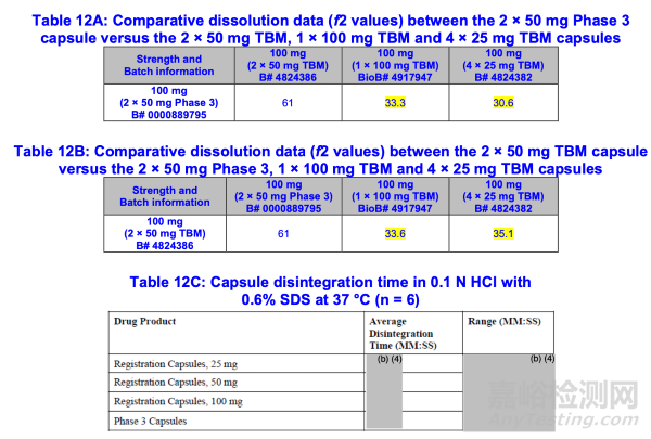 根據(jù)所提交的信息,100毫克(1×100毫克)TBM膠囊顯示出與100毫克(4×25毫克)TBM膠囊相似的溶出曲線(f2>50)。然而,100毫克(2×50毫克)TBM膠囊的溶出曲線與100毫克(1×100毫克)TBM膠囊存在差異(f2<50)。FDA注意到,100毫克(1×100毫克)TBM膠囊的溶出曲線(按標(biāo)示量%計)與25毫克(1×25毫克)及50毫克(1×50毫克)TBM膠囊存在差異(f2<50)。