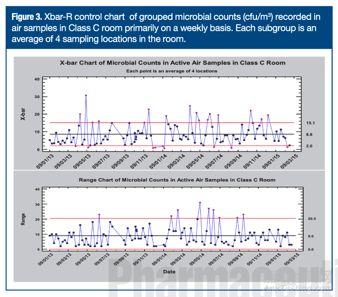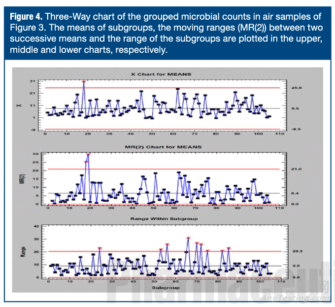正如前文所述,當(dāng)過程運(yùn)行中存在多個(gè)顯著大于組內(nèi)變異的變異源時(shí),分組數(shù)據(jù)的Xbar-R或Xbar-S控制圖可能出現(xiàn)超限值過多現(xiàn)象。圖3再現(xiàn)了此類行為的典型案例,該圖展示了C級潔凈室空氣微生物計(jì)數(shù)(cfu/m³)的監(jiān)測數(shù)據(jù),每次采樣覆蓋四個(gè)點(diǎn)位。室內(nèi)四個(gè)點(diǎn)位的微生物計(jì)數(shù)被判定為同質(zhì)子組,隨后通過Xbar-R控制圖評估監(jiān)測過程。若認(rèn)為同一潔凈室污染水平可能隨采樣時(shí)間(即每周)波動(dòng),則Shewhart控制圖恒定變異的基本要求往往無法滿足(參見第一部分)。