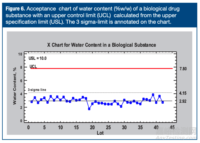 藥品的某些質(zhì)量屬性經(jīng)常在遠(yuǎn)低于標(biāo)準(zhǔn)限度的控制限之間波動(dòng)(即過程能力極高的工藝)。例如某生物原料藥的水分標(biāo)準(zhǔn)限度為10.0%(重量/重量)(圖6)。傳統(tǒng)的均值+3σ控制限(4.15)顯然與標(biāo)準(zhǔn)限度存在安全裕度,對應(yīng)的過程能力指數(shù)Cpk為5.75,過程性能指數(shù)Ppk為5.35。對此類高能力工藝可采用驗(yàn)收控制圖進(jìn)行監(jiān)控。這類控制圖采用與傳統(tǒng)控制限不同的"修正后控制限"。