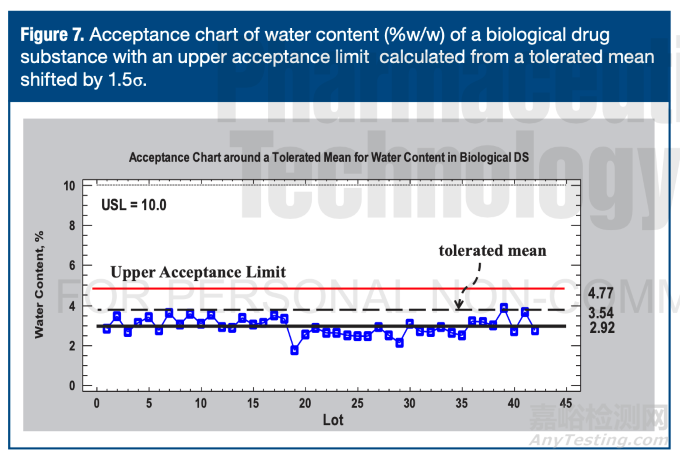 其中一類驗(yàn)收控制圖是基于客戶標(biāo)準(zhǔn)限度(單邊或雙邊)構(gòu)建,可采用以下三種參數(shù)組合:拒收質(zhì)量水平與β風(fēng)險(xiǎn);可接受質(zhì)量水平與α風(fēng)險(xiǎn);或同時(shí)采用拒收與可接受質(zhì)量水平。圖6即為某生物原料藥水分的驗(yàn)收控制圖,其控制限從3西格瑪限值4.15調(diào)整為7.80%。該限值是基于可接受的不合格率0.0001%與β風(fēng)險(xiǎn)0.05推導(dǎo)得出。