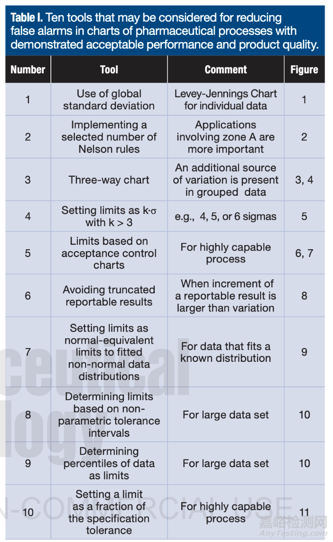 建議采取十種實(shí)用工具或措施(見表一),用于最大限度減少實(shí)際流程數(shù)據(jù)在圖表中原樣繪制時(shí)產(chǎn)生的誤報(bào)警,前提是同步驗(yàn)證工藝性能及產(chǎn)品質(zhì)量處于受控狀態(tài)。這些工具將減少對實(shí)際處于受控狀態(tài)的生產(chǎn)流程中表面無害偏差開展無謂調(diào)查的情況。