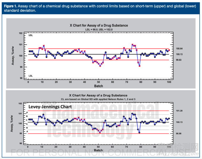 制藥行業(yè)收集的數(shù)據(jù)多為個(gè)體數(shù)據(jù)類型,傳統(tǒng)SPC使用短期變異確定控制限。但來自11家生物技術(shù)公司的行業(yè)專家建議,大多數(shù)控制圖應(yīng)采用西格瑪?shù)拈L期估計(jì)值(即全局或長期標(biāo)準(zhǔn)差)。這種基于全體數(shù)據(jù)點(diǎn)計(jì)算的標(biāo)準(zhǔn)差通常更大,因此會使上下控制限分別擴(kuò)大和縮小。基于全局標(biāo)準(zhǔn)差的控制圖被稱為Levey-Jennings圖。