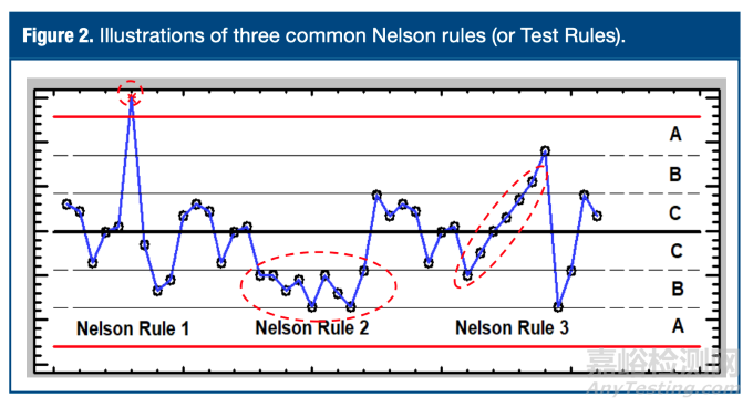 圖1展示僅應(yīng)用尼爾森規(guī)則1、2、3的Levey-Jennings圖示。 若采用三級管控模式(1),可將控制限定義為行動(dòng)限,尼爾森2、3作為預(yù)警信號; 若采用二級模式,則控制限作為預(yù)警限,忽略尼爾森2、3。 甚至可限定僅當(dāng)尼爾森2和/或3涉及靠近3σ控制限的A區(qū)時(shí)才觸發(fā)。