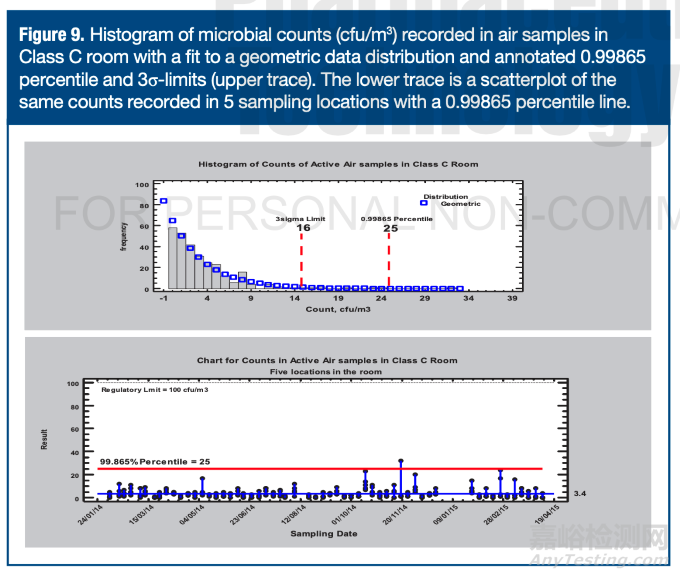 從定義明確的分布(尤其是重尾分布)數(shù)據(jù)中計(jì)算3σ限值會導(dǎo)致多達(dá)2個(gè)數(shù)據(jù)點(diǎn)的2.5%超出限值。如Wheeler所示。如果認(rèn)為這種情況不可接受,可以嘗試將數(shù)據(jù)擬合到已知的非正態(tài)分布模型并推導(dǎo)正態(tài)等效限值(即能包含99.73%數(shù)據(jù)的0.00135和0.99865百分位數(shù))。超出正態(tài)等效限值的數(shù)值數(shù)量少于超出3σ限值的數(shù)量。圖9的下部軌跡顯示了C級潔凈室五個(gè)區(qū)域記錄的285個(gè)空氣微生物采樣計(jì)數(shù)的分布(法規(guī)限值為100 cfu/m³)。上部軌跡顯示數(shù)據(jù)與幾何分布的擬合效果良好(卡方檢驗(yàn)p值為0.085),計(jì)算得到的0.99865百分位限值為25 cfu/m³。傳統(tǒng)3σ限值的簡單計(jì)算結(jié)果為16 cfu/m³。這兩個(gè)限值分別被1個(gè)(0.35%)和7個(gè)(2.45%)數(shù)據(jù)點(diǎn)超出。