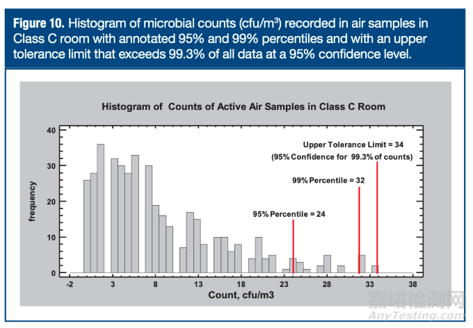 一種更簡便的非參數(shù)方法來設(shè)定警報(bào)或行動(dòng)限是直接計(jì)算第k百分位數(shù)(0<k<100)。這種百分位法已應(yīng)用于圖10中的同源數(shù)據(jù)集。95%和99%百分位數(shù)分別為24和32 cfu/m³,并在直方圖上標(biāo)注。這些數(shù)值可分別作為警報(bào)限和行動(dòng)限的設(shè)置依據(jù)。