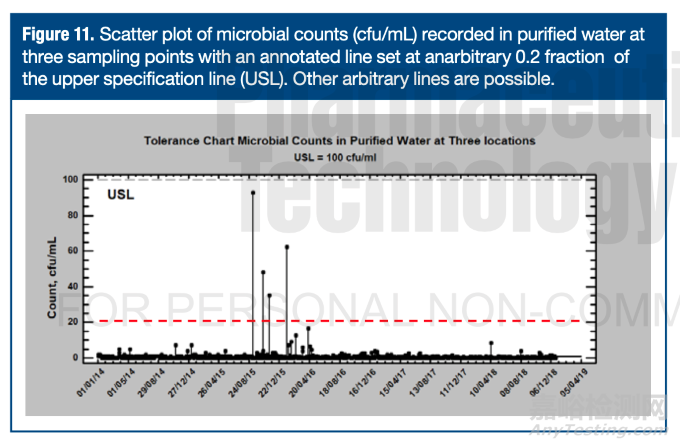 "企業(yè)應(yīng)基于歷史數(shù)據(jù)或水質(zhì)標(biāo)準(zhǔn)比例建立過程控制水平"(25)。筆者觀察到兩家生物科技公司將C級區(qū)原始終處于個(gè)位數(shù)微生物水平的100 cfu/m³法規(guī)限值,分別設(shè)定為50%或80%的經(jīng)驗(yàn)限值。圖11顯示了三個(gè)采樣點(diǎn)的純化水微生物計(jì)數(shù),絕大多數(shù)數(shù)值遠(yuǎn)低于100 cfu/mL的規(guī)格限??捎幸鈱⒕瘓?bào)限設(shè)定為規(guī)格允差的合理比例(如20或50 cfu/mL),并將規(guī)格限(100 cfu/mL)作為行動(dòng)限。此方法同樣需要長期穩(wěn)定運(yùn)行的工藝實(shí)踐證明所選警報(bào)限的合理性。