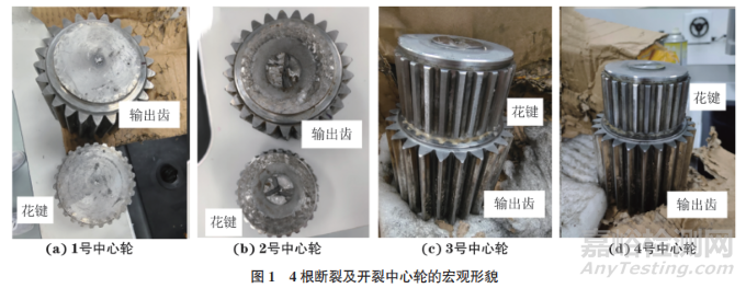該機組偏航系統(tǒng)采用4臺偏航電機驅動齒輪箱提供動力,搭配液壓制動完成偏航動作。4根斷裂及開裂中心輪的宏觀形貌如圖1所示。由圖1可知:4根中心輪的輸出齒和花鍵表面均無明顯變形、開裂及疲勞損傷,嚙合痕跡正常,說明部件齒條、齒面強度無異常,不存在異常偏載現(xiàn)象;1號、2號中心輪從花鍵側軸肩位置斷開,3號、4號中心輪未斷開,但軸肩位置有不同程度的微裂紋;1號中心輪的斷口表面摩擦磨損情況嚴重,斷口初始特征消失,推測其最先發(fā)生斷裂,原因是中心輪斷裂后的偏航電機依舊執(zhí)行同步變槳指令而持續(xù)運轉,導致兩側斷口因轉速差而持續(xù)產(chǎn)生配合磨損,且持續(xù)時間較長。
