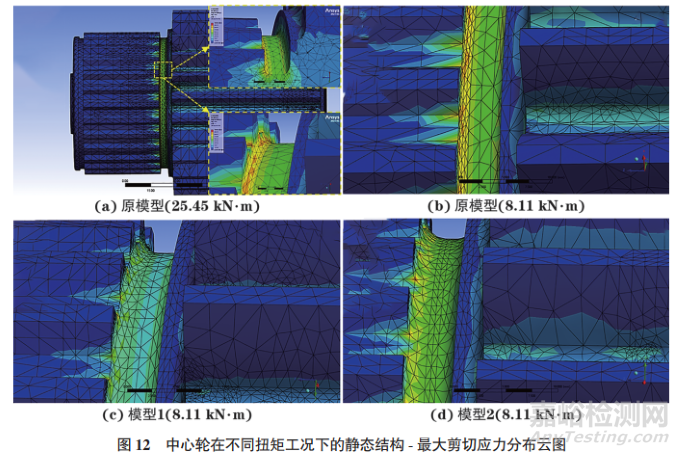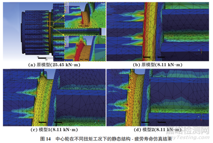 根據(jù)4級中心輪的實物和設計圖紙校核仿真計算模型關鍵區(qū)域的尺寸,其中花鍵側軸肩R角半徑為1.0mm,輸出齒側軸肩R角半徑為1.5 mm。借助Ansys軟件進行計算時,設定三齒嚙合、軸向分量載荷均載、花鍵雙側剛性約束,以還原實際工況,設定材料疲勞強度因子為工程經(jīng)驗值0.8,采用Gerber平均應力理論分析疲勞壽命,采取高質量加密網(wǎng)格,并設定等效應力迭代收斂10% 為計算要求。計算結果如圖11~14所示。由圖11~14可知:當原模型中心輪齒條表面嚙合正常,且承受25.45kN·m的瞬間極值扭矩時,其軸肩R角、花鍵根部為高應力區(qū),花鍵側R角處承受應力最大,局部剪切應力、等效交變應力均超出了材料設計極限,會使材料出現(xiàn)損傷;當承受8.11kN·m的等效扭矩時,軸肩 R角、花鍵根部雖然為高應力區(qū),但應力明顯減弱,等效應力和剪切應力符合設計要求;在8.11kN·m的等效扭矩作用下,優(yōu)化花鍵R角尺寸為模型1,軸肩R角的應力降低了約16%,軸肩應力為355.7~ 508.5MPa,且危險位置轉移至花鍵齒條根部與端部交接尖角處,軸肩極限疲勞壽命提升了約84%;優(yōu)化花鍵位置、輸出齒側的軸肩R角尺寸為模型2,等效應力、交變應力和疲勞壽命幾乎與模型1保持一致,改善效果不明顯。綜合考慮部件的工程優(yōu)化經(jīng)驗、加工難度及裝配關系,優(yōu)化花鍵側R角半徑為1.5mm是改善該中心輪軸肩應力狀態(tài)、優(yōu)化綜合疲勞壽命的最佳措施。