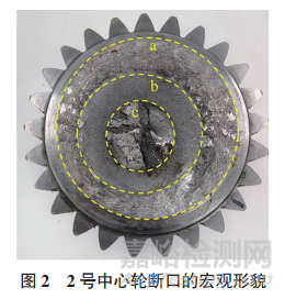 2號中心輪斷口的宏觀形貌如圖2 所示。由圖2可知:斷口參差不齊,斷面可以依照粗糙度、摩擦磨損程度、斷面光澤情況區(qū)分為3個區(qū)域,a區(qū)為起源與初始擴展區(qū),裂紋圍繞花鍵側的軸肩不斷向內部擴展;b區(qū)為裂紋擴展區(qū),斷面相對平滑,顏色較暗,整體摩擦痕跡較輕;c區(qū)為瞬時斷裂區(qū),中心殘留棘輪狀花樣,瞬斷區(qū)占比較小。推測該中心輪的斷裂性質為低應力扭轉疲勞斷裂。