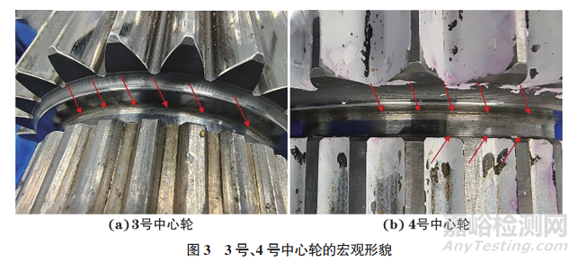 3號、4號中心輪軸肩位置均存在呈環(huán)繞形的不連續(xù)裂紋(見圖3),說明中心輪的軸肩位置為裂紋源區(qū),且屬于多源起裂。
