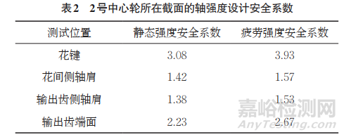 2號中心輪強度校核結果如表1所示,其所在截面的軸強度設計安全系數(shù)如表2所示。由表1,2可知:2號中心輪的計算等效扭矩不超過極限轉矩,各項強度設計安全系數(shù)均滿足GL IV-1∶2010《工業(yè)服務規(guī)則和指南 第4部分:風力渦輪機認證指南》的要求,軸的危險截面計算結果滿足設計要求,但接觸強度的安全系數(shù)設計值偏低,兩個軸肩部位的安全系數(shù)較小,軸肩部位為危險截面。
