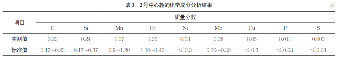 2號中心輪的化學成分分析結果如表3所示。由表3可知:2號中心輪的化學成分符合GB/T 3077—2015《合金結構鋼》對20CrMnMo鋼的要求。