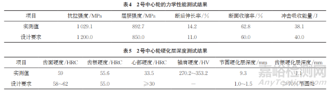 2號中心輪的力學性能測試結果如表4所示,其硬化層深度測試結果如表5所示。由表4,5可知:2號中心輪心部的抗拉強度、沖擊性能略低于設計要求,硬度滿足設計要求,齒根部位有效硬化層深度合格,軸肩部位硬度與心部硬度基本一致,說明軸肩位置的硬度均勻,未經(jīng)過異常加工硬化和特殊工藝處理;輸出齒的有效硬化層深度過大。中心輪生產(chǎn)工藝為表面滲碳淬火,推測輸出齒在齒面成型后的淬火過程中工藝控制不當,導致其被完全淬透,但該現(xiàn)象僅對齒條強度有影響,不是引發(fā)軸肩斷裂的主要原因。