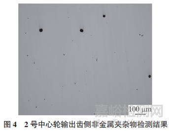 該中心輪輸出齒的淬火工藝控制不當,導致齒條的有效硬化層深度為9.3mm,遠超設計要求的1.0~1.5mm,導致齒條韌性降低,減弱了其對沖擊載荷的緩解能力。中心輪的抗拉強度、沖擊性能均低于設計指標,表明材料抗斷裂性能較差。冶煉工藝殘留在基體中隨機分布的非金屬夾雜物降低了材料的極限強度,材料產(chǎn)生了應力集中,造成中心輪開裂。
