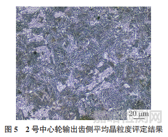 參照GB/T 6394—2017《金屬平均晶粒度測定方法》對2號中心輪輸出齒側進行平均晶粒度評定,結果如圖5所示。經(jīng)分析判定,花鍵、軸肩、輸出齒不同位置的平均晶粒度等級均不低于9.0級,滿足技術要求(不小于5級)。
