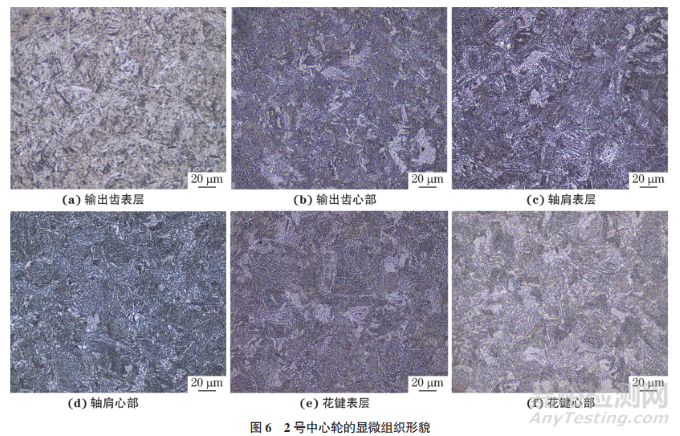 參照GB/T 25744—2010《鋼件滲碳淬回火金相檢驗》對2號中心輪的顯微組織進行觀察,結果如圖6所示。由圖6可知:該中心輪經(jīng)滲碳淬火+回火處理,輸出齒的表層組織為針狀馬氏體+ 少量殘余奧氏體,心部組織為貝氏體+ 低碳馬氏體;軸肩部位的表層、心部組織均為貝氏體+低碳馬氏體,符合技術要求,顯微組織未見異常。