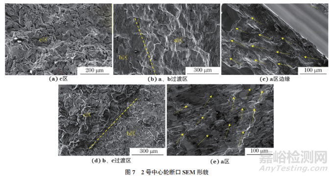 用丙酮、乙醇超聲清洗2號中心輪斷口試樣,然后將其置于SEM下觀察,結果如圖7所示。由圖7可知:該中心輪斷口初始裂紋源區(qū)域存在的摩擦痕跡最嚴重,裂紋呈階梯式向內擴展,多處缺口位置特征一致,說明材料發(fā)生了多源開裂,裂紋緩慢向內擴展;a區(qū)以階梯式斷裂為主,b區(qū)臺階擴展形貌消失,斷口較平滑,摩擦痕跡減輕,a、b 過渡區(qū)位置存在多處扭轉裂紋,說明b區(qū)的裂紋擴展速率明顯加快;b、c過渡區(qū)形貌突變明顯,出現(xiàn)扭轉撕裂棱,微觀形貌特征趨向于沿晶斷裂,并伴隨少許剪切韌窩特征,說明斷裂速率明顯加快,由裂紋的加速擴展轉變?yōu)椴牧系乃矔r斷裂;瞬斷區(qū)c區(qū)的占比較?。s為15.6%)。