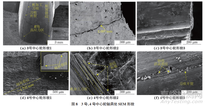 在3 號、4號中心輪的軸肩處取樣,對試樣進行SEM分析,結果如圖8所示。由圖8可知:兩個中心輪兩側軸肩局部殘留的毛刺、刀槽機等加工刀痕較明顯,多處裂紋與加工刀痕重合;3 號、4號中心輪未斷裂花鍵側的裂紋徑向擴展深度分別約為2.10,1.73mm,兩側軸肩過渡R角的設計尺寸(半徑)分別為1.5mm(輸出齒側)、1.0mm(花鍵側),設計粗糙度為3.2mm。重載類傳動部件的R角過小會引發(fā)應力集中,導致部件發(fā)生開裂,中心輪的強度校核結果也證實了兩側軸肩過渡區(qū)是該中心輪的危險截面。加工刀痕也會產(chǎn)生缺口效應,降低材料的疲勞裂紋擴展門檻值和臨界應力場強度因子,工作時材料易產(chǎn)生應力集中,加速裂紋的萌生和擴展,縮短材料的疲勞壽命。
