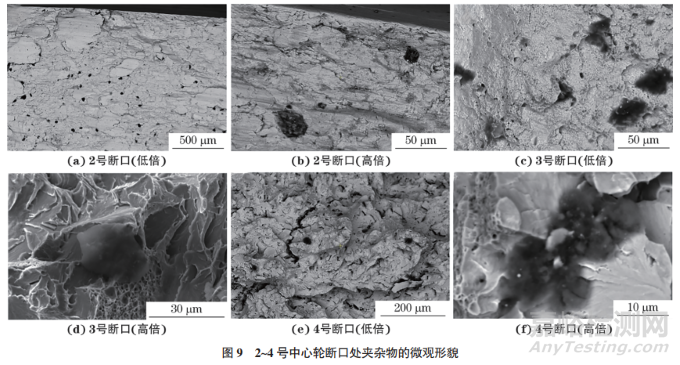 將3號、4號中心輪沿裂紋人工打開,2~4號中心輪斷口處夾雜物的微觀形貌如圖9所示。由圖9可知:3個中心輪斷口處的夾雜物形貌基本相同。