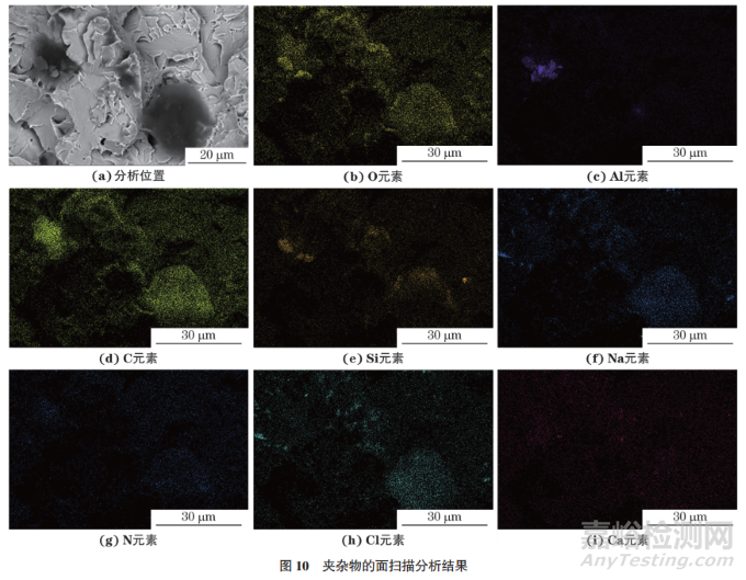 利用能譜儀對夾雜物進行面掃描分析,結果如圖10所示。由圖10可知:夾雜物為Al、Si系氧化物,為原材料熔煉、精煉后的遺留產(chǎn)物。夾雜物彌散分布在金屬基體中,使基體的強度降低,導致材料產(chǎn)生應力集中,并最終發(fā)生開裂。
