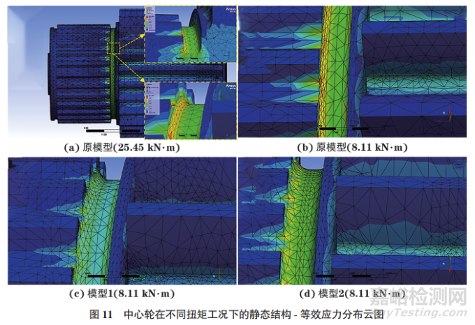 根據(jù)該系列中心輪的工作載荷要求及4級結構傳動比進行綜合計算,其承載的極限扭矩為25.45kN·m,該類工況所占整個產(chǎn)品的生命周期不足萬分之一,因此計算當量疲勞載荷對應的等效扭矩約為8.11kN·m,故極限工況計算供參考,重點以等效扭矩進行靜態(tài)結構的等效應力和疲勞壽命計算。