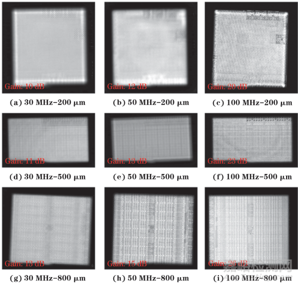 不同厚度(200,500,800 μm)的芯片在不同頻率換能器下的聲學(xué)掃描圖像如圖3所示,其掃描范圍分別為15 mm×15 mm,20 mm×15 mm和20 mm×20 mm,不同掃描頻率對應(yīng)的放大器增益已在圖中標(biāo)出。