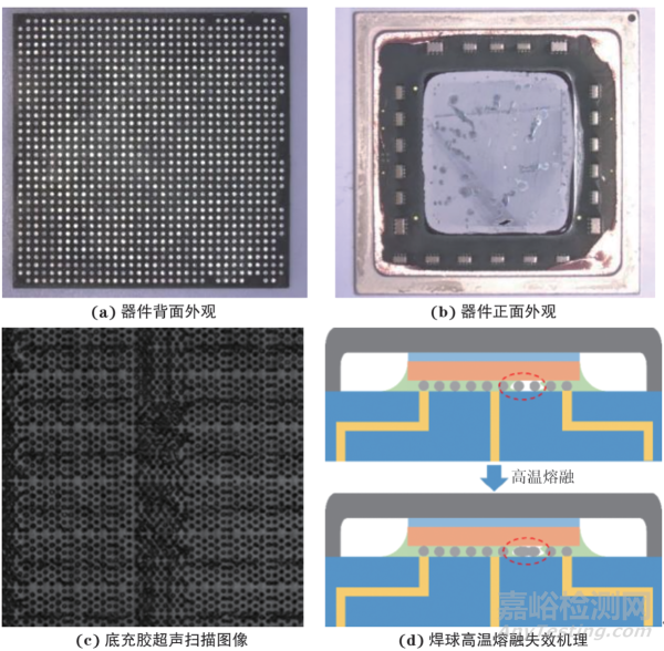 器件外觀、超聲掃描圖像及失效機(jī)理如圖5所示。由器件的背面外觀可以發(fā)現(xiàn)BGA焊球分布均勻,未出現(xiàn)明顯的黏連現(xiàn)象,初步排除外焊點熔融短接造成短路的可能。