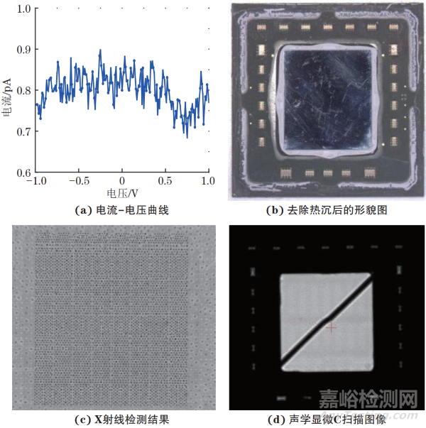 圖7 失效器件的電流-電壓曲線、去除熱沉后的形貌圖、X射線檢測結(jié)果和聲學(xué)顯微C掃圖像