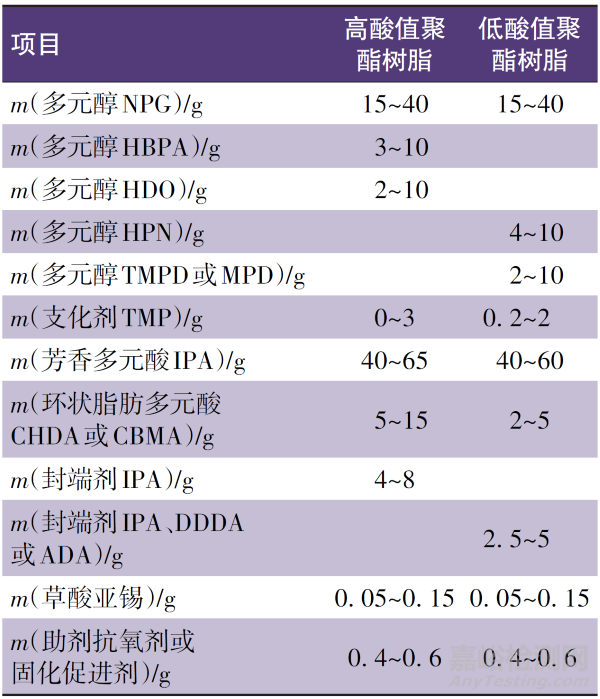 Table 1 The basic formula of polyester resins with high and low acid value