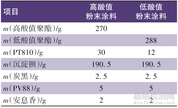 按表2配方稱料、預(yù)混,經(jīng)過(guò)擠出機(jī)熔融混合、壓片、磨粉、過(guò)篩得到高酸值粉末涂料和低酸值粉末涂料,將高/低酸值粉末涂料按質(zhì)量比1∶1充分混合均勻,采用靜電噴涂在除油除銹的冷軋鋼板上或經(jīng)表面處理的鋁板上,在200 ℃/10 min條件下固化得到涂膜樣板并檢測(cè)相關(guān)性能,膜厚控制在60~90 μm。
