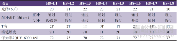 粉末涂料的耐沸水性是衡量其在高溫高濕環(huán)境下穩(wěn)定性的重要指標(biāo)。同樣選擇P9050TG/P9620TG制備的涂膜作為H8-L8的參比涂膜,同時(shí)進(jìn)行了水煮實(shí)驗(yàn),結(jié)果如圖2所示。
