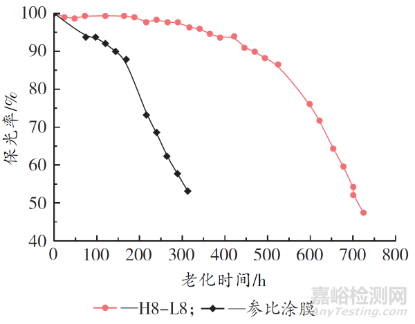 由圖1可知,常規(guī)耐候雙組分涂膜在169 h內(nèi)出現(xiàn)輕微失光,失光率為12.1%;在169 h 后失光現(xiàn)象加劇,保光率急劇下降,到313 h時(shí)就降至53.1%。而H8-L8涂膜在422 h內(nèi)都無(wú)明顯失光現(xiàn)象,保光率保持在94%以上。隨著時(shí)間延長(zhǎng),涂膜出現(xiàn)輕微失光現(xiàn)象,保光率開(kāi)始下降,不過(guò)下降幅度明顯較少。在525 h后,保光率下降幅度加大,最終在725 h時(shí)維持了47.4%的保光率。H8-L8涂膜在經(jīng)過(guò)QUV加速老化測(cè)試600 h后,保光率仍維持在65%~75%,這一表現(xiàn)符合超耐候粉末涂料的標(biāo)準(zhǔn)。