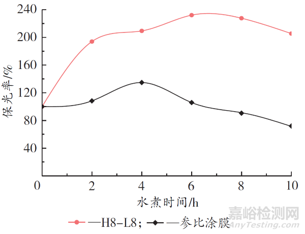 由圖2可知,2種涂膜水煮后保光率都呈現(xiàn)出先上升后下降的趨勢(shì),對(duì)常規(guī)耐候的雙組分涂膜來(lái)說(shuō),保光率在4 h 后開(kāi)始下降,水煮10 h 后僅有71.4%。相比之下,H8-L8涂膜表現(xiàn)出更優(yōu)異的耐沸水性,其保光率在水煮6 h后才開(kāi)始略有下降,并在10 h后,保光率仍然保持在205.5%的較高水平。