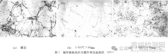 目前國內(nèi)外對冷變形后的再結(jié)晶研究較多,對經(jīng)高溫變形的0Cr19Ni9N 大鍛件熱處理后的再結(jié)晶報道較少。由于奧氏體鋼大鍛件的生產(chǎn)需要多次鍛造,每次的加熱溫度較高,容易造成粗晶,如果最后一次的鍛造有一定的變形量,則可在隨后的熱處理過程中通過再結(jié)晶來改善組織。研究人員就0Cr19Ni9N奧氏體鋼大鍛件的再結(jié)晶進(jìn)行探討。