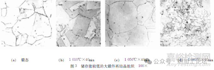 再結(jié)晶是一個形核長大的過程,再結(jié)晶晶核是通過在變形基體中產(chǎn)生一些具有高遷移率的大角度晶界的無應(yīng)變區(qū)而形成。因晶界、第二相等具有的位錯密度高,易形成高儲存能差區(qū),而儲存能差是再結(jié)晶形核的驅(qū)動力。對經(jīng)熱加工的奧氏體不銹鋼大鍛件,晶界是優(yōu)先形核處(圖3c) ,1010℃×2h固溶處理后,大晶粒的晶界出現(xiàn)了再結(jié)晶晶粒。