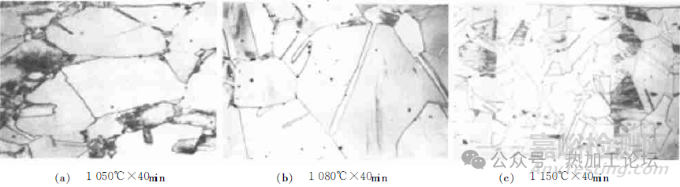 圖1為最后一次鍛造變形量較大( 約23%) 時,其鍛態(tài)組織儲存能較高的大鍛件再結(jié)晶組織。由圖1a可見,鍛件的原始組織粗大,有少量的碎化晶粒,高溫形變后遺留下的滑移線很多,表明鍛件經(jīng)受了較大的高溫變形量;經(jīng)1010℃×40min 固溶處理后(圖1b) ,晶粒尺寸還是較粗大,此階段可能主要發(fā)生了回復(fù)過程;繼續(xù)提高固溶溫度,經(jīng)1050℃×40min 固溶處理后(圖1c),組織已發(fā)生了明顯的再結(jié)晶,晶粒明顯細(xì)化。