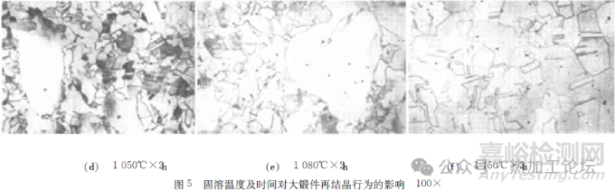 如原始晶粒尺寸與圖1相近,但組織中遺留的應(yīng)變能較少時,其再結(jié)晶組織見圖3。由圖3a 可見,鍛件的原始組織粗大,高溫形變后遺留下的滑移線較少,表明鍛件最后一次的高溫變形量沒有圖1大。經(jīng)1010℃×40min、1050℃×40min 固溶處理后( 圖3b 、c) ,晶粒尺寸還是較粗大,此階段可能主要發(fā)生了回復(fù)過程,再結(jié)晶進(jìn)行得較少,1010℃×40min 固溶處理后熱變形遺留的滑移線還存在(圖3b) ;繼續(xù)提高固溶溫度,經(jīng)1080℃×40min 固溶處理后( 圖3d) ,已發(fā)生明顯再結(jié)晶,晶粒明顯細(xì)化。
