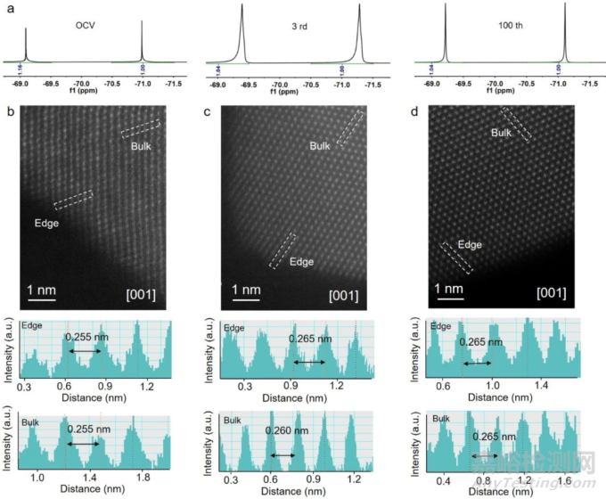 經(jīng)過(guò)3次循環(huán)后,NaPF6分子形態(tài)開(kāi)始分解,但其含量在100次循環(huán)后趨于穩(wěn)定(圖2a),這表明NaPF6水解生成HF的反應(yīng)會(huì)持續(xù)至水分完全消耗。盡管徹底消除水分不可行,但在電池制造過(guò)程中必須嚴(yán)格控制水分以最小化副反應(yīng)。利用像差校正高角環(huán)形暗場(chǎng)掃描透射電鏡(HAADF-STEM)對(duì)NFMNO在不同狀態(tài)下的原子相和結(jié)構(gòu)進(jìn)行表征(圖2b-2d)。為增強(qiáng)可比性,所有觀測(cè)均沿[001]晶帶軸取向。初始狀態(tài)下體相與邊緣原子排列一致,層間距為0.255 nm(圖2b);3次循環(huán)后邊緣層間距(0.265 nm)大于體相(0.260 nm),隨著反應(yīng)深度增加,電化學(xué)反應(yīng)動(dòng)力學(xué)可能減緩導(dǎo)致內(nèi)層鈉離子嵌入量減少,但未觀察到晶面畸變(圖2c);經(jīng)過(guò)100次循環(huán)充分活化后層間距增大至0.265 nm,依然未出現(xiàn)晶格畸變(圖2d)。擴(kuò)展觀測(cè)其他顆粒也發(fā)現(xiàn)相同現(xiàn)象,由此得出結(jié)論:過(guò)渡金屬離子溶出的主因是不穩(wěn)定Fe4+奪取溶劑電子弱化Fe-O鍵及產(chǎn)物HF的共同作用,而非電化學(xué)反應(yīng)過(guò)程中的結(jié)構(gòu)畸變。因此,最有效的解決途徑是通過(guò)引入特定添加劑優(yōu)化電解液組分。