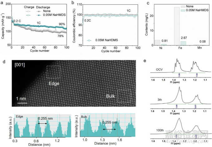 為驗(yàn)證該理論對(duì)實(shí)驗(yàn)的指導(dǎo)作用,我們?cè)陔娊庖褐刑砑覰aHMDS(濃度0.05 M),通過(guò)電化學(xué)性能測(cè)試系統(tǒng)考察了添加劑對(duì)電解液組分、結(jié)構(gòu)穩(wěn)定性和CEI界面的影響。當(dāng)電流提升至1 C時(shí),90%的容量保持率和99.99%的庫(kù)侖效率均顯著優(yōu)于未添加劑的對(duì)照組(圖4a-b),且電解液鐵離子濃度僅為未添加劑的十分之一(2.67 mg/L)(圖4c)。為進(jìn)一步評(píng)估實(shí)際應(yīng)用可行性,我們組裝測(cè)試了4 Ah NFMNO//硬碳軟包電池。結(jié)果表明,添加NaHMDS的軟包電池在0.2 C下可實(shí)現(xiàn)接近100%的庫(kù)侖效率,性能明顯優(yōu)于未添加劑的對(duì)照組,這充分證實(shí)了所選添加劑的有效性。從結(jié)構(gòu)分析入手,無(wú)論是顆粒邊緣還是體相結(jié)構(gòu),經(jīng)過(guò)3次或100次循環(huán)后均未出現(xiàn)可觀測(cè)的結(jié)構(gòu)變化,層間距保持穩(wěn)定(圖4d)。其次,對(duì)電解液組分進(jìn)行分析:19F NMR譜圖顯示FEC在循環(huán)過(guò)程中持續(xù)消耗,至第10次循環(huán)時(shí)完全耗盡,全部參與形成CEI膜;1H NMR譜圖表明DEC在前3次循環(huán)中逐漸減少并貢獻(xiàn)于CEI膜形成。值得注意的是,與無(wú)添加劑體系不同,含NaHMDS的電解液中DEC含量在100次循環(huán)后保持穩(wěn)定,證明DEC氧化反應(yīng)被有效抑制(圖4e)。