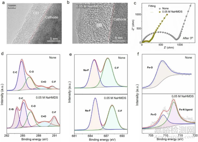界面特性差異研究顯示:無(wú)添加劑體系的CEI層厚度為6 nm,而含NaHMDS添加劑體系在3次循環(huán)后CEI層增至12 nm(圖5a-b),這與NMR結(jié)果相互印證。經(jīng)過(guò)100次循環(huán)后,電極表面均勻分布的小尺寸無(wú)機(jī)顆粒促進(jìn)了鈉離子傳輸。電化學(xué)阻抗譜(EIS)測(cè)試表明,含添加劑體系在3次循環(huán)后的界面層電阻(Rf)和電荷轉(zhuǎn)移電阻(Rct)均更低(圖5c)。雖然10次循環(huán)后兩組體系的Rf均有所增加,但無(wú)添加劑體系的電阻增長(zhǎng)更為顯著;相比之下,含NaHMDS體系的Rf值在50次循環(huán)后趨于穩(wěn)定,證明該添加劑能有效抑制溶劑氧化分解。通過(guò)XPS對(duì)CEI層進(jìn)行組分分析:與對(duì)照組相比,含添加劑的正極表面出現(xiàn)C-Si峰(圖5d),證實(shí)添加劑分解產(chǎn)物吸附于正極材料;同時(shí)NaF含量顯著增加(圖5e),這與NaHMDS促進(jìn)HF轉(zhuǎn)化為NaF的反應(yīng)機(jī)制相符。除Fe-O鍵外,含NaHMDS的界面還檢測(cè)到Fe-N鍵(圖5f),確證添加劑與鐵離子的配位作用。這種相互作用既抑制了鐵離子溶出,又提升了庫(kù)侖效率與循環(huán)穩(wěn)定性。