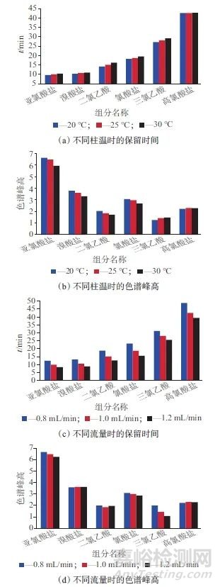 在相同流量下,將柱溫分別設(shè)定為20、25、30 ℃;在相同柱溫下,將淋洗液流量分別設(shè)定為0.8、1.0、1.2 mL/min,分別考察相同質(zhì)量濃度的6種陰離子在不同柱溫、不同淋洗液流量時的保留時間和色譜峰高,結(jié)果如圖1所示。由圖1可以看出,6種陰離子的保留時間均與柱溫呈現(xiàn)正相關(guān)關(guān)系,而與淋洗液流量呈負(fù)相關(guān)關(guān)系。即在一定范圍內(nèi),柱溫越低、淋洗液流量越高,檢測時間越短。色譜峰高是待測離子洗脫出最大濃度時檢測器響應(yīng)的信號值,在相同濃度下,峰高值越大,代表當(dāng)前條件下儀器對待測離子的響應(yīng)越靈敏。三氯乙酸、高氯酸鹽峰高與柱溫為正相關(guān),其他4種陰離子與柱溫呈現(xiàn)負(fù)相關(guān)。亞氯酸鹽、氯酸鹽和三氯乙酸峰高與流量呈負(fù)相關(guān),其他3種陰離子相關(guān)系數(shù)較低。在日常檢測中,柱溫設(shè)置為20 ℃時,實時溫度受環(huán)境溫度影響易波動,而柱溫為30 ℃時,二氯乙酸的分離受干擾物影響變大,故選擇柱溫為25 ℃。淋洗液流量低時,樣品分析時間長,峰型寬,而流量高時,亞氯酸鹽和溴酸鹽峰部分重疊,故選擇流量1.0 mL/min。